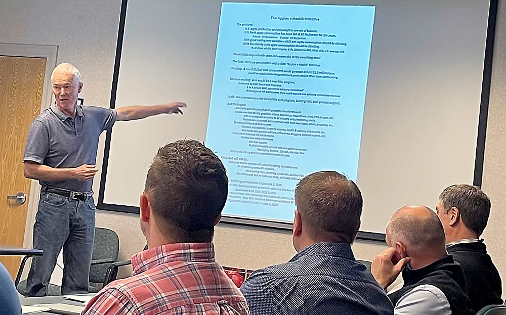 Doug Pauly of Northern Fruit speaks to the Washington Apple Commission during a May 23 meeting in Yakima about his proposal to launch a collective health messaging program. Though board members were positive about the general idea of health messaging in the face of declining consumption, no action was taken following Pauly’s pitch.