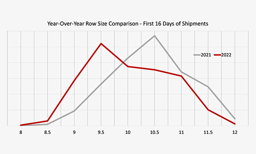 A sizing chart released last week by the Yakima, Washington-based organization charged with collectively promoting cherries from five Northwest states shows row sizing measurements from the first 16 days of shipments skewing larger — peaking at 9.5 compared to last year’s 10.5.