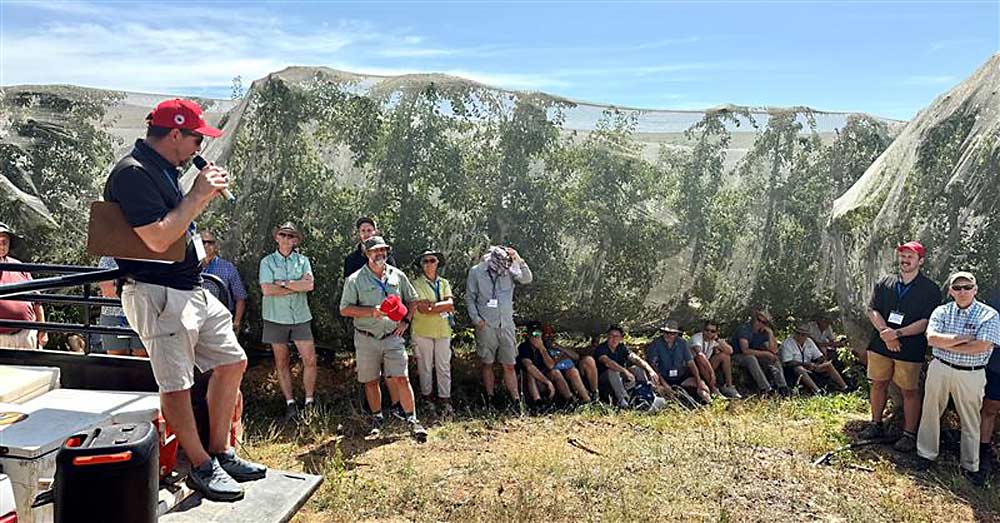 Graeme Krige, left, technical director for the Two-A-Day Group cooperative talks to International Fruit Tree Association tour attendees about the benefits of shade netting for reducing sunburn on apples and pears at Oewerzicht Farm in Greyton, South Africa.