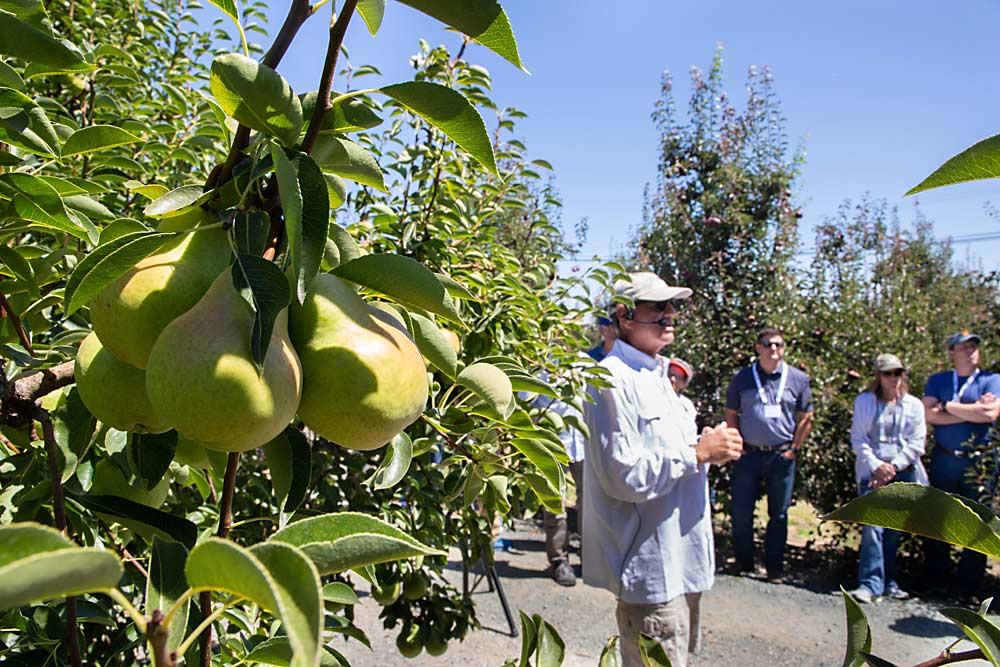 Robert Arceo of Rivermaid Trading Co. discusses growing Bartlett and Hailey Red pears on July 16 during the International Fruit Tree Association summer tour near Sacramento, California.