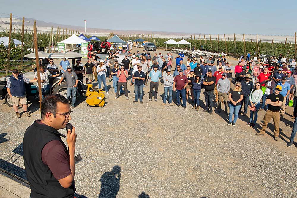 At the field day, the group split into three tracks to hear five-minute presentations from more than 20 vendors with technologies ranging from an above-canopy evapotranspiration meter to an automated, tree-by-tree fertilizer applicator to an electric weed zapper. Demonstrations from self-driving equipment, such as the Prospr automated sprayer from Robotics Plus and the electric, driverless tractor from Monarch, were included.