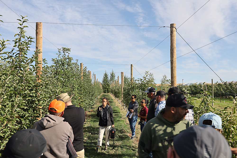 Washington State University extension specialist Bernardita Sallato, center, provides a preharvest tour on Sept. 17 through a demonstration block at the Roza Research Farm in Prosser, where WSU’s new variety, WA 64, is planted on different rootstocks and training systems to help growers get to know how it performs.