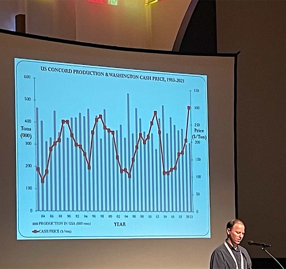 The industry’s official statistician, Trent Ball, shared how a combination of low production, low inventories and low imports resulted in a significant price jump for Washington producers. Cash price for Concords rose to $300 per ton, a 46 percent increase over 2020 and a price not seen since the mid ‘90s, said Ball, who directs the vineyard and winery technology program and Yakima Valley College.