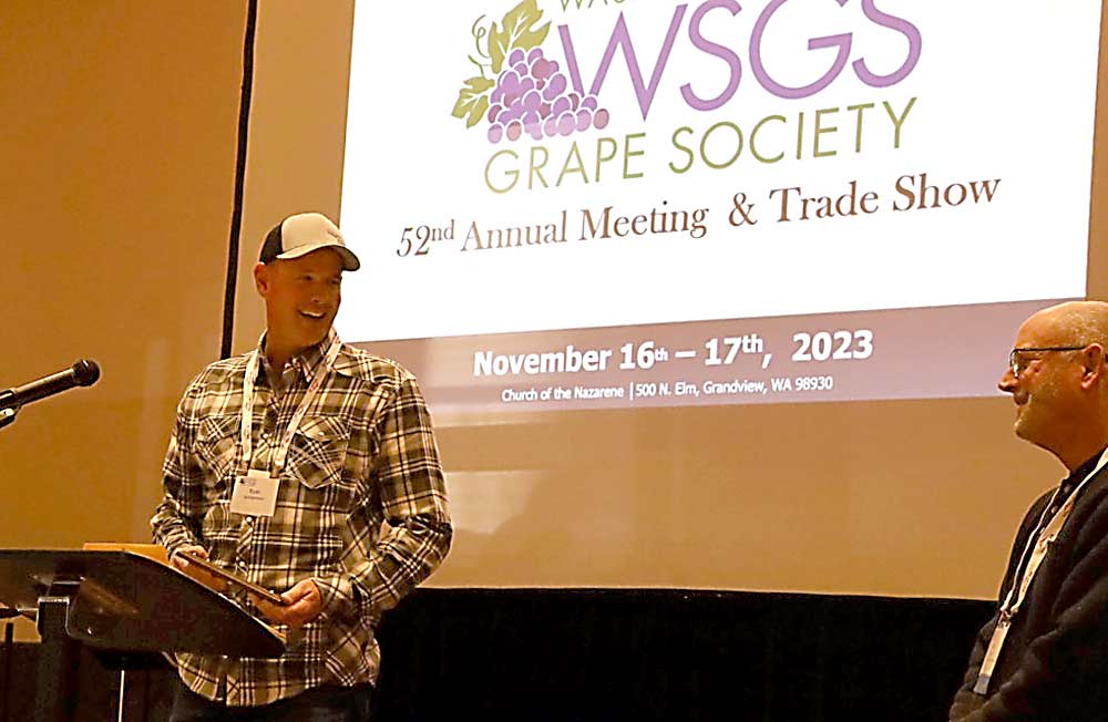 Grower Ryan Schilperoort accepts the Washington State Grape Society’s Lloyd H. Porter Grower of the Year Award from society present Keith Oliver, at right.