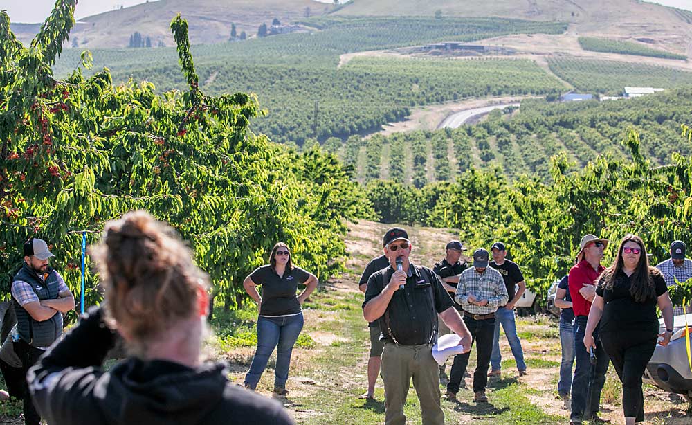 Ken Polehn, center, answers questions about the Pearl series of cherries during the 2023 Oregon State University preharvest cherry tour on June 6 in The Dalles.