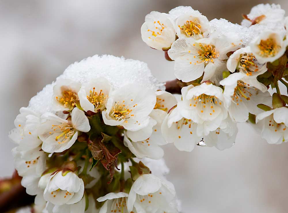 —If snow settles on blossoms, don’t try to remove it. The snow doesn’t hurt, and it can even help.