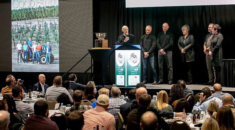 From left: Bill, Pete, David, Holly Douglas Wilson, John and Jill Douglas accept the Good Fruit Growers of the Year Award during the 119th Washington State Tree Fruit Association Annual Meeting banquet on Dec. 5 in Kennewick, Washington.