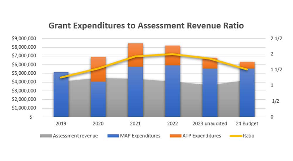 This chart, presented at the Washington Apple Commission board meeting in October, shows the significant impact Market Access Program (MAP) and Agricultural Trade Promotion Program (ATP) grant funds have had in expanding the commission’s promotional budget in recent years.