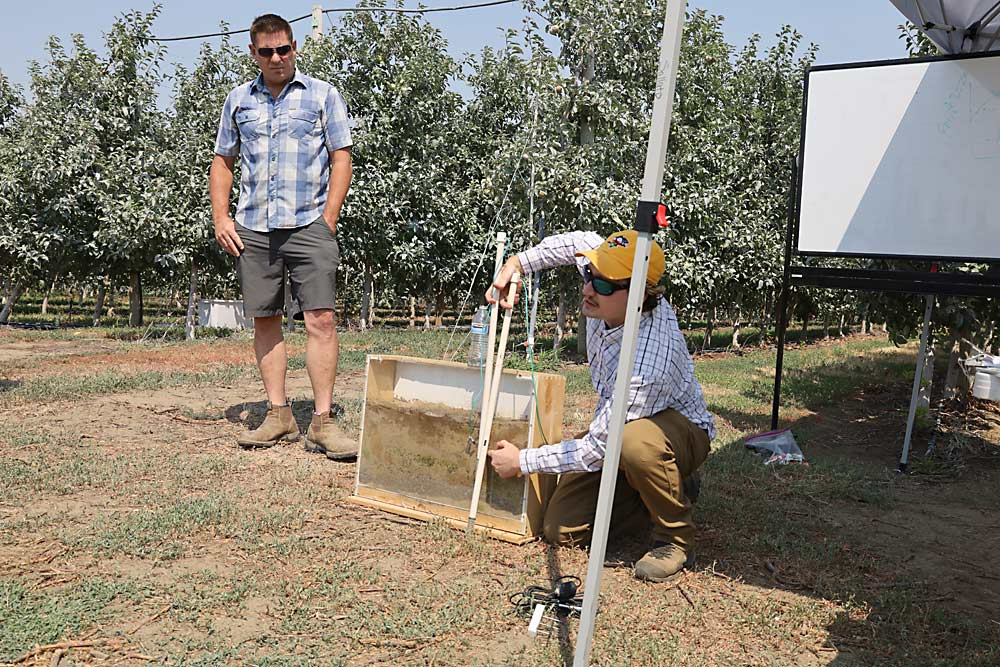 Taggares Fruit Co. hosted the field day in a Fuji block at its Snake River Orchards, where the company is collaborating with scientists from WSU and the U.S. Department of Agriculture to host a trial that tracks tree stress with a variety of sensors under deficit irrigation regimes.