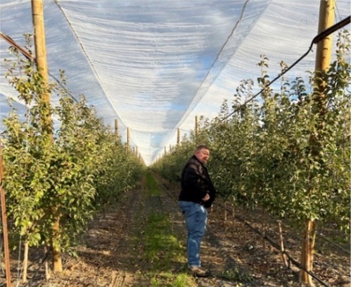 Operated by NWFM, an agricultural management company with Central Washington tree acreage, the orchard consists of 30 acres of WA 38 apples on M9.337 rootstocks, said Keith Veselka, managing partner. It was planted in 2021 and features high-density fruiting walls, net coverings, drip irrigation, under-tree microsprinklers and over-canopy misters.